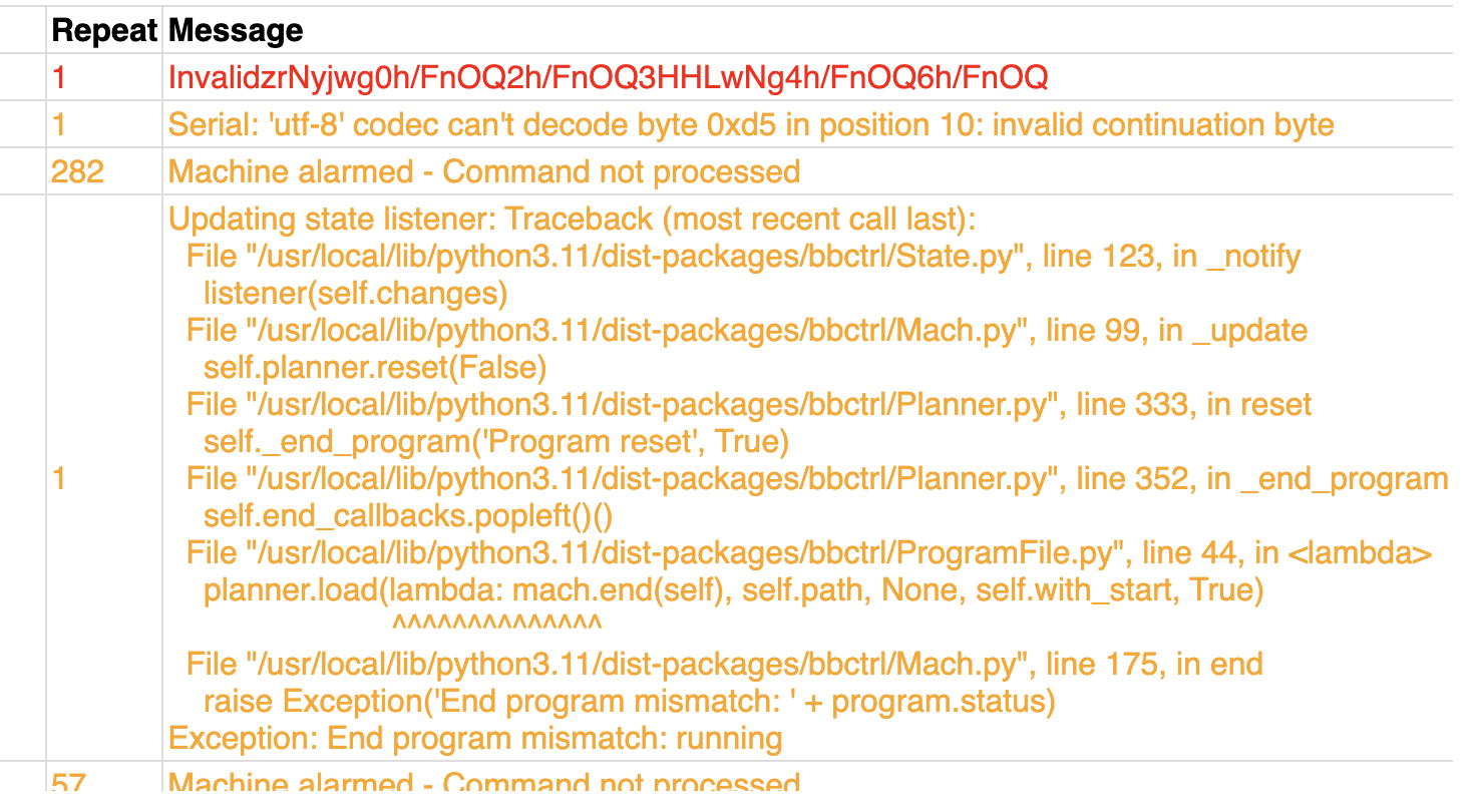 the other day I faced a more or less critical error in the middle of a program which stopped and seemingly reset the machine (and homing). Unfortunately the error message is quite cryptic and I have no idea what could have caused this